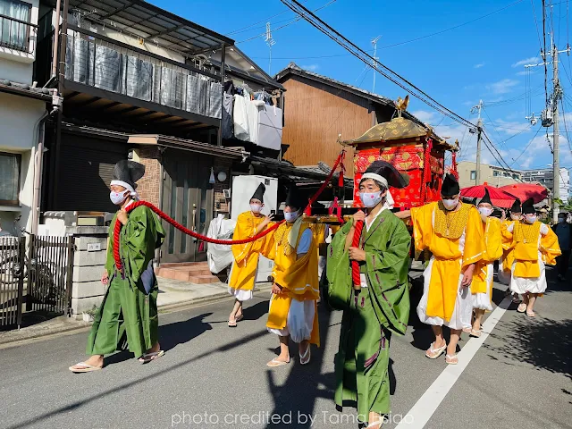 來參加之前,在京都総合観光案内所的觀光Navi網站上(很好用的官方觀光網站,剛來京都時,我每一週都會透過上面的行事曆搜尋公開活動,會分類為傳統行事、點燈活動、音樂劇場、旅行體驗與美食等,大家可以很好運用!)ずいき祭為期5天(10/1~10/5-2022年),祭禮日程分別有神幸祭(第一天)、献茶祭(第二天)、甲御供奉饌(第三天)、還幸祭(第四天)、后宴祭(第五天),一系列的傳統行事,大部分參加巡行者,主要參與神幸祭或還幸祭,分別從北野天滿宮走到西ノ京御旅所,後者則是再從西ノ京御旅所走回北野天滿宮。而我這次參加的是第一天神幸祭的遊行。